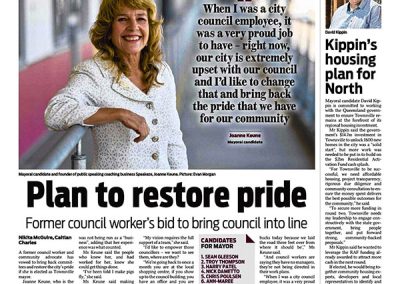 Joanne’s drive to get Townsville moving has sparked strong local interest. Her advocacy on practical fixes, like restoring effective Council committees, getting back to basics with roads and services, and protecting our green spaces, has been covered across multiple newspaper features and community columns.